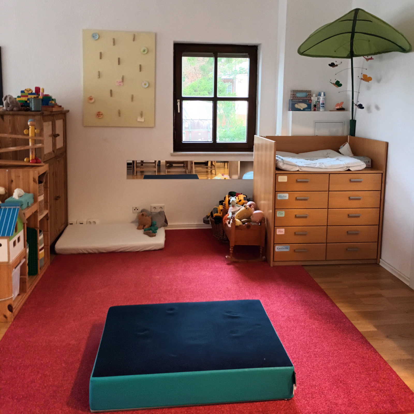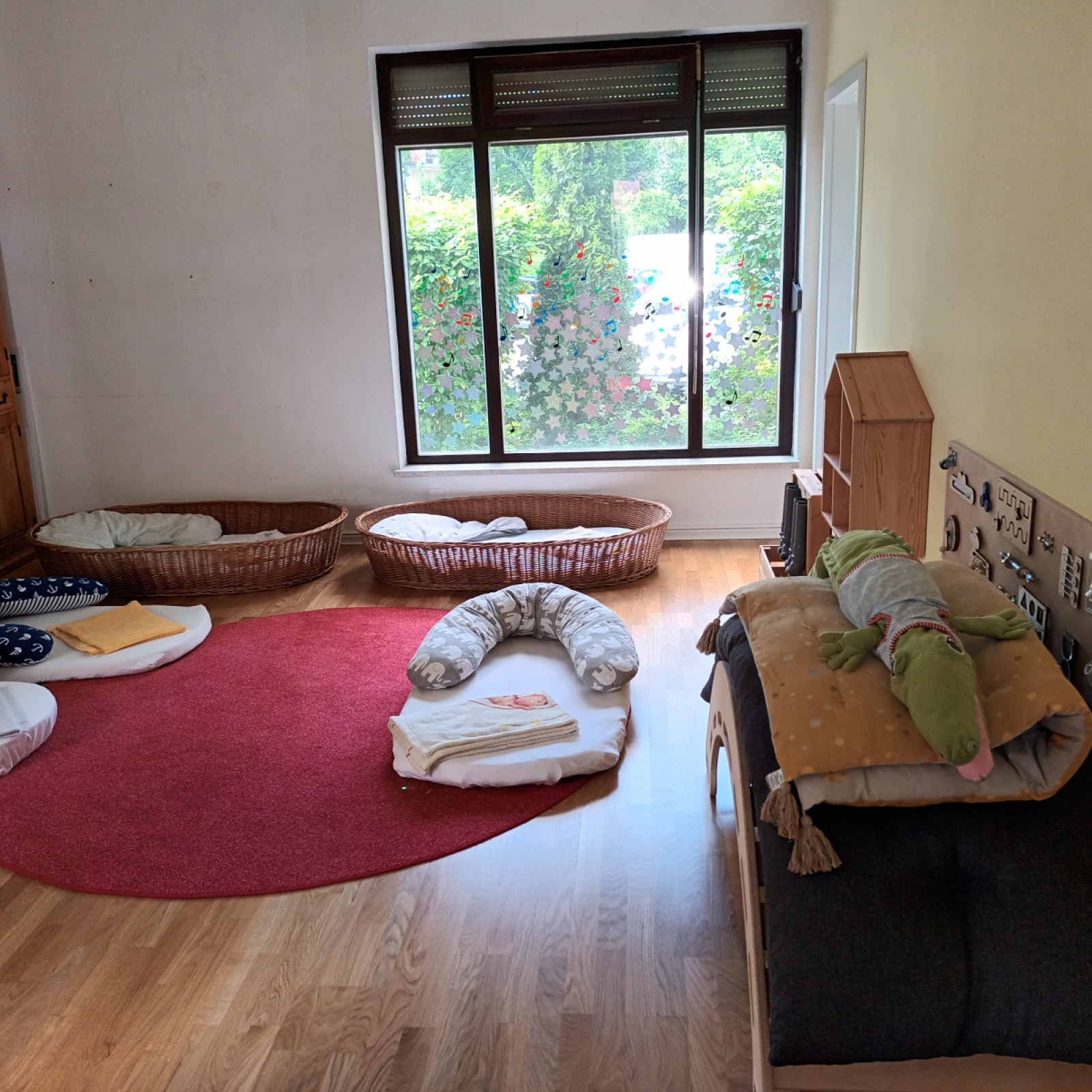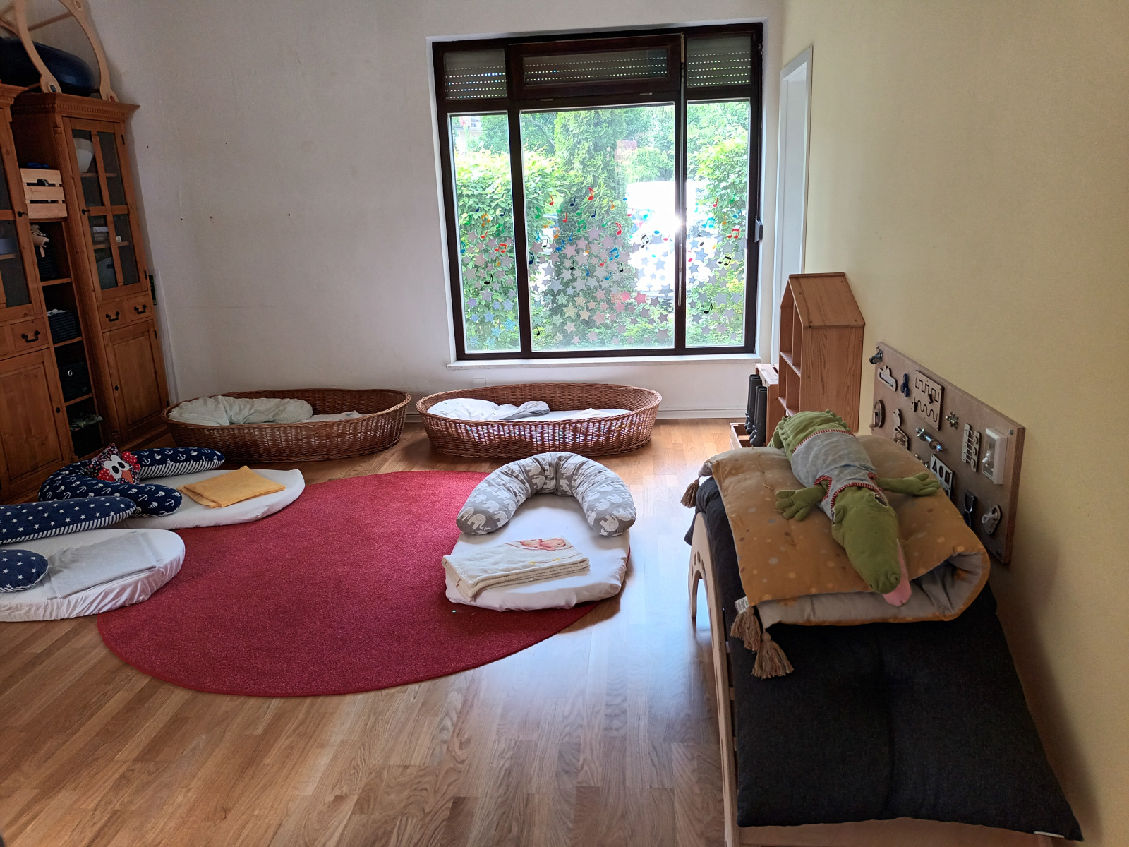 Der Schlafraum ist mit Schlafkörben für die Kinder ausgestattet und kann tagsüber als zusätzlicher Raum zum Spielen und für Bewegung genutzt werden.