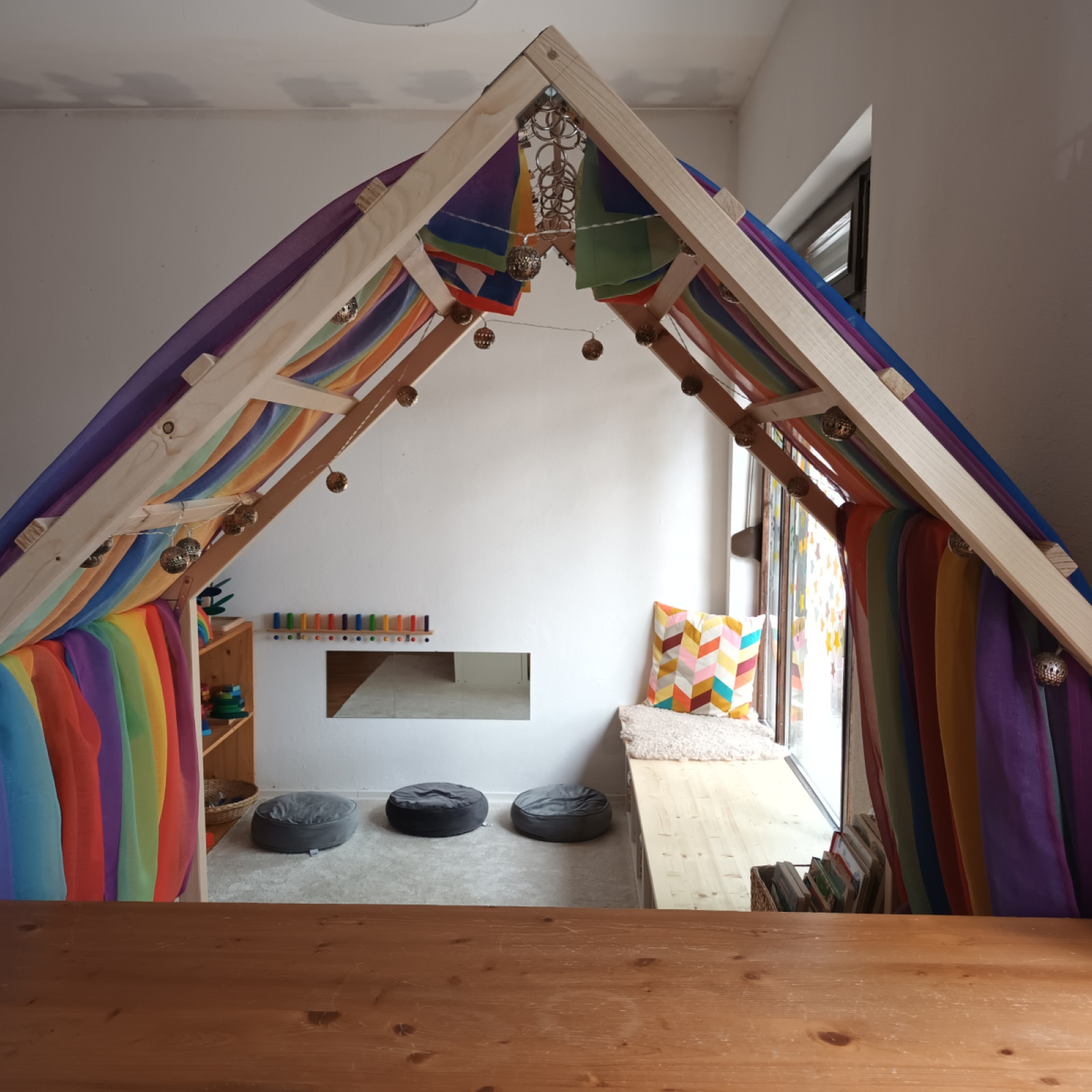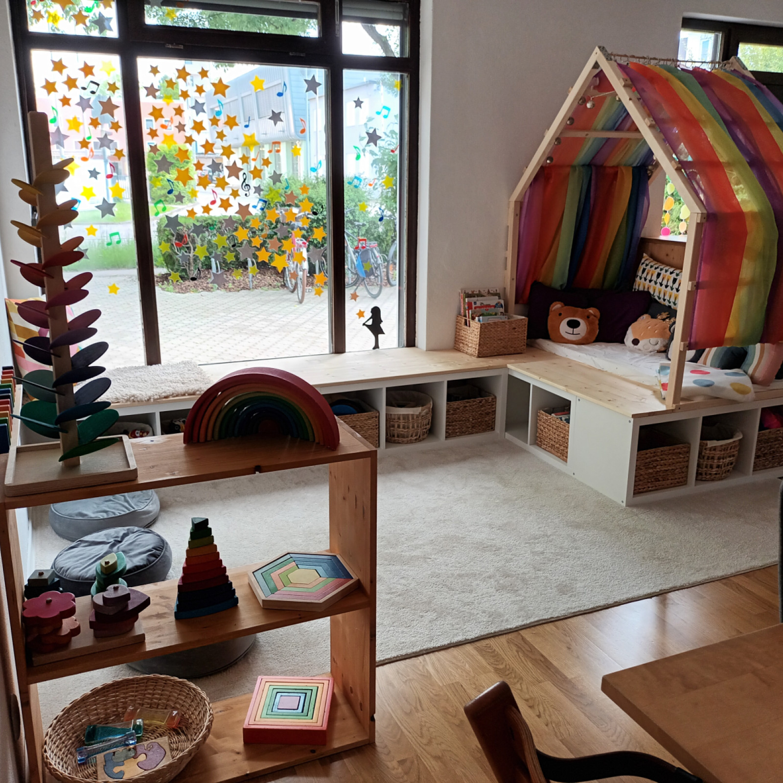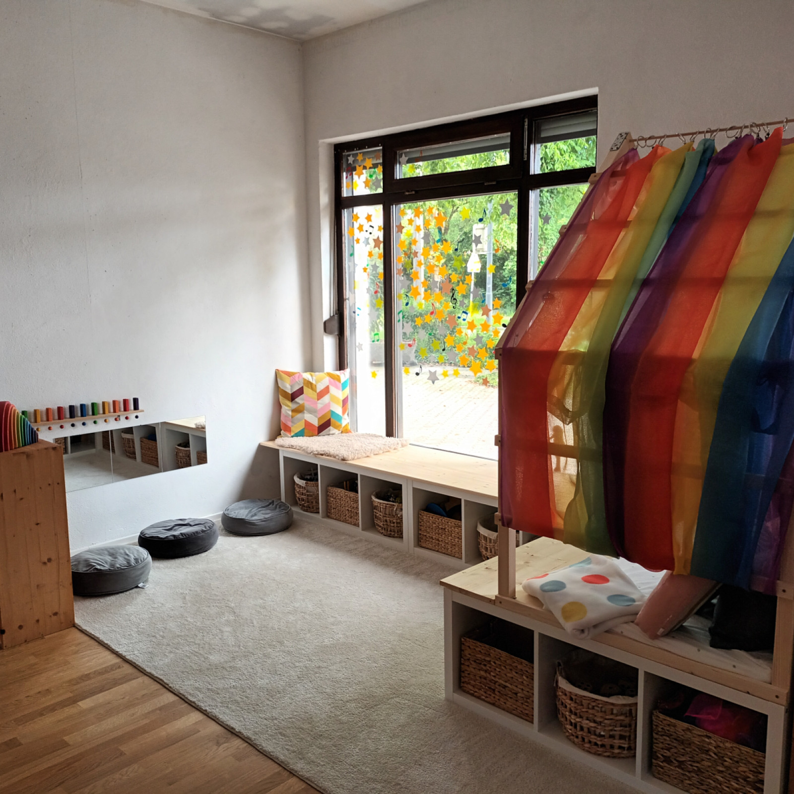 Der Schlafraum ist mit Schlafkörben für die Kinder ausgestattet und kann tagsüber als zusätzlicher Raum zum Spielen und für Bewegung genutzt werden.